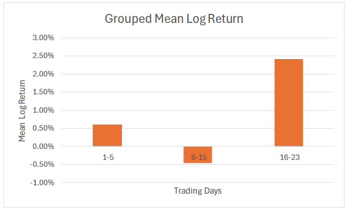 As an initial exploratory step, I grouped average returns by trading interval around the turn of the month. This provides a first indication of whether a systematic pattern may exist. Figure 1 presents the average returns across these intervals and offers a preliminary view of how performance differs between the end and the beginning of the month.