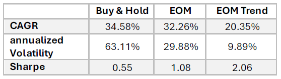 Turning to risk-adjusted performance, Buy & Hold produces a Sharpe ratio of 0.55, which is modest given the extreme volatility involved. The EOM strategy improves the Sharpe ratio to 1.08, indicating that focusing exposure around month-end substantially enhances return per unit of risk. The EOM Trend strategy achieves a Sharpe ratio of 2.06, an exceptionally strong result that reflects highly efficient risk-adjusted performance over the full sample.