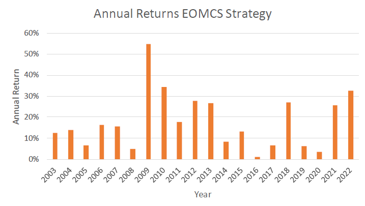 Across two decades of data, the EOMCS strategy demonstrates striking consistency. A 17.09% CAGR, coupled with no negative calendar years.