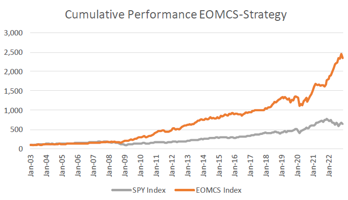 Prior to 2008, SPY exhibited a similar cumulative performance relative to the EOMC strategy. Following the onset of the post-crisis recovery in 2009, this relationship changed, with the EOMCS strategy demonstrating sustained outperformance over SPY throughout the subsequent period.