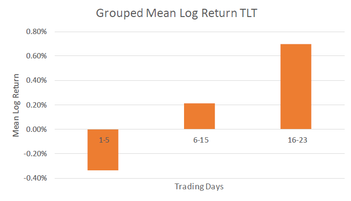 Part 1 showed that TLT usually performs the worst at the start of the month and tends to perform the best near the end. This means that its returns aren’t evenly spread out over the month but follow a noticeable pattern. Figure 1 illustrates this trend clearly, making it easier to see how TLT’s performance changes from the beginning to the end of each month.